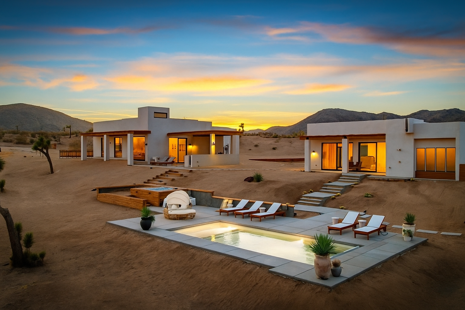 Spa themed retreat on 30 Acres only 4 miles to the center of Joshua Tree. Crafted from the ground up with your pleasant stay in mind. With no immediate neighbors you will truly feel the calmness of the desert as you gaze towards countless Joshua Trees and the national park with your morning coffee in hand. Amenities include a heated pool, massive custom sauna, professional cold plunge, 8 person hot tub, sun deck, private yoga studio for 16 or dining facility for 18, outdoor shower, chef's kitchen, EV charger, smokeless firepit, bocce court, 5 hammocks and a private disc golf course. Larger parties (up to 17) please inquire as our sister property five minutes down the road sleeps 9.